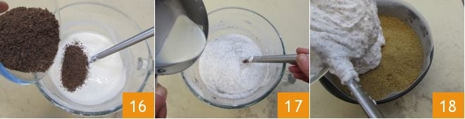 et incorporez-le au mélange en amalgamant avec une spatule 16, puis versez également la gélatine dissoute dans la crème 17. Mélangez le tout délicatement et versez sur la base, en la distribuant soigneusement et en la nivelant avec une spatule 18.