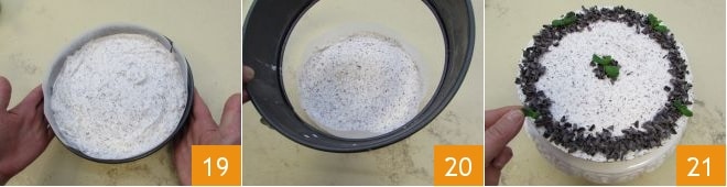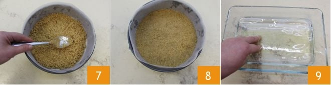 Beurrez et tapissez de papier cuisson un moule à charnière de 22 cm de diamètre. Versez les biscuits émiettés dans le moule et nivelez soigneusement en vous aidant du dos de la cuillère 7; mettez au réfrigérateur pendant une demi-heure 8 et occupez-vous de la crème. Faites tremper la gélatine dans un récipient avec de l'eau froide pendant 10 minutes 9.