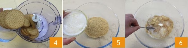 Maintenant, vous pouvez préparer la base du cheesecake. Faites fondre le beurre dans une casserole à feu doux; puis mettez les biscuits dans le mixeur 4; hachez-les finement et versez le mélange sableux dans un grand bol; ajoutez le beurre fondu maintenant tiède 5 et mélangez bien le tout avec une cuillère 6.