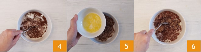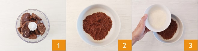 Pour préparer le cheesecake coco et Nutella, commencez par beurrer et tapisser de papier sulfurisé un moule à charnière de 18 cm. Continuez en préparant la base : faites fondre le beurre à feu très doux, puis mixez les biscuits au robot 1, transférez la poudre dans un bol 2 et ajoutez la noix de coco râpée 3.