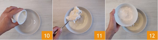 Versez dans un bol le yaourt au coco 10, ajoutez le fromage à tartiner 11 et le sucre glace 12.