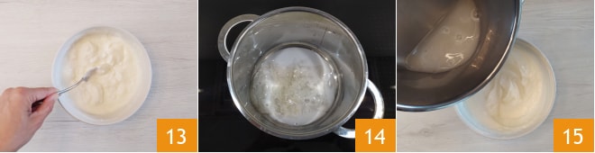 Mélangez pour incorporer tous les ingrédients 13. À ce stade, égouttez la gélatine et versez-la dans une petite casserole avec le lait de coco 14, faites fondre à feu doux en remuant constamment. Versez sur la crème 15.