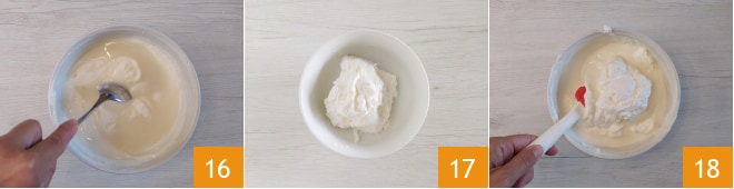 Mélangez bien 16 et montez la crème en chantilly 17. Ensuite, ajoutez-la à la crème 18.
