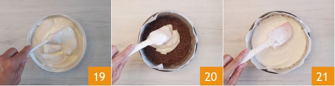 Prenez soin de l'incorporer délicatement en effectuant des mouvements doux de bas en haut 19. Transférez le tout sur la base de biscuits 20 et nivelez la surface 21.