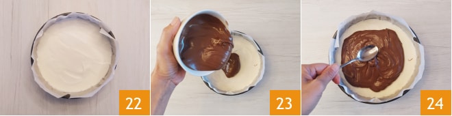 Mettez le gâteau à raffermir au réfrigérateur pendant au moins 2 heures (mieux 3 ou 4 heures pour qu'il soit bien ferme) 22. Une fois le temps écoulé, récupérez le gâteau du réfrigérateur, versez Nutella dans un bol et travaillez-la avec une cuillère pour l'assouplir. Puis versez sur la surface du gâteau 23 et répartissez-la uniformément avec le dos d'une cuillère 24.
