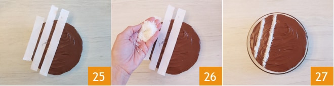 Posez délicatement trois petites bandes de papier sulfurisé, légèrement espacées les unes des autres, sur un des bords du gâteau 25, laissez tomber la noix de coco râpée 26 et voilà votre cheesecake coco et Nutella prêt 27.