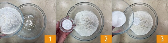 Pour préparer les chiacchiere de Carnaval : frites, au four et farcies, commencez par réaliser la pâte. Dans un bol, versez la farine 1, la levure chimique 2 et le sucre 3.