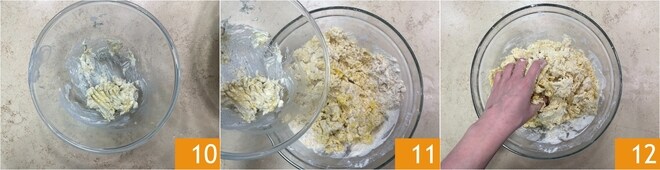 Une fois que vous avez obtenu une crème 10, ajoutez-la à la pâte 11 et continuez à travailler avec les mains dans le bol 12.