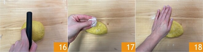 Pour préparer les chiacchiere au four, après que la pâte a reposé, prélevez-en une portion 16 et gardez le reste bien couvert. Saupoudrez alors d'un peu de farine 17 et aplatissez-la d'abord avec les mains 18.