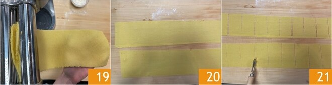 Passez-la ensuite plusieurs fois dans la machine à pâtes, en réduisant progressivement l'épaisseur 19 et en repliant la pâte avant de l'insérer à nouveau. Vous devez obtenir des bandes épaisses de 2 mm 20. Laissez sécher légèrement les feuilles pendant quelques minutes, puis avec une roulette dentelée, découpez des rectangles d'environ 5x10 cm 21.