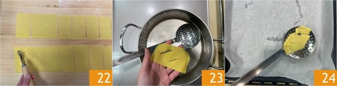 Faites des entailles obliques au centre 22, puis faites cuire les chiacchiere dans de l'eau bouillante 23 jusqu'à ce qu'elles remontent à la surface. Ensuite, égouttez-les avec une écumoire et transférez-les sur une plaque recouverte de papier sulfurisé 24.