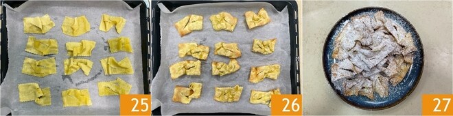 Essayez de leur donner un peu de mouvement avec les mains, sans les étendre complètement 25 et faites cuire dans un four ventilé préchauffé à 200° pendant 5 minutes de chaque côté. Lorsqu'elles sont bien dorées, sortez les chiacchiere du four 26, laissez-les tiédir et saupoudrez-les de sucre glace 27.