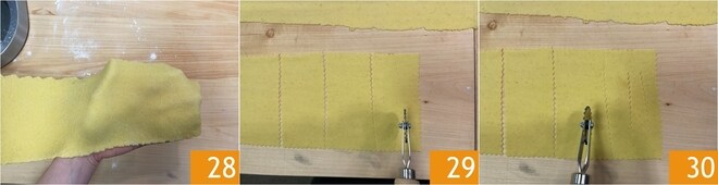 Pour préparer les chiacchiere frites, prélevez une partie de la pâte et étalez-la comme précédemment jusqu'à obtenir une épaisseur de 2 mm 28. Laissez sécher légèrement la feuille et avec la roulette dentelée, découpez ensuite des rectangles de 5x10 cm 29 et réalisez des incisions au centre dans le sens de la longueur 30.