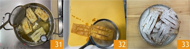 Faites frire quelques chiacchiere à la fois dans une grande quantité d'huile de graines chaude 31. La température idéale est de 150-160°, nous vous conseillons de vous munir d'un thermomètre et de la mesurer pour une friture parfaite. Lorsqu'elles sont bien dorées, égouttez-les avec une écumoire et transférez-les sur du papier absorbant 32. Laissez refroidir et servez en saupoudrant de sucre glace 33.