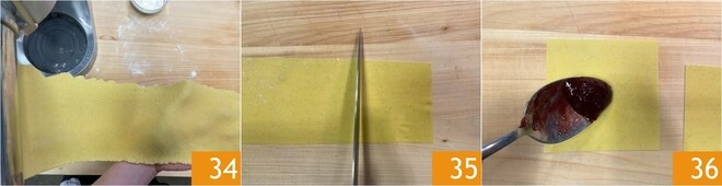 Enfin, nous vous montrerons comment préparer les chiacchiere farcies et frites. Vous devrez étendre la pâte plusieurs fois dans la machine, en réduisant progressivement l'épaisseur jusqu'à obtenir une feuille épaisse de 2 mm 34. De celle-ci, vous devrez simplement découper des carrés de 10x10 cm et les farcir en plaçant au centre une cuillère à café de confiture 36.
