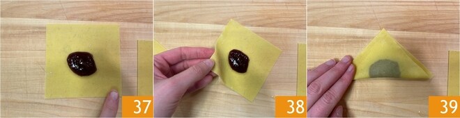 Maintenant, humidifiez les bords de la pâte 27 et refermez la chiacchiera farcie 38 en triangle. Pressez bien les bords pour faire sortir tout l'air 39. Préparez ainsi toutes les autres.