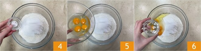 Ajoutez aussi une pincée de sel 4, les 3 œufs avec le jaune 5 et la grappa 6.