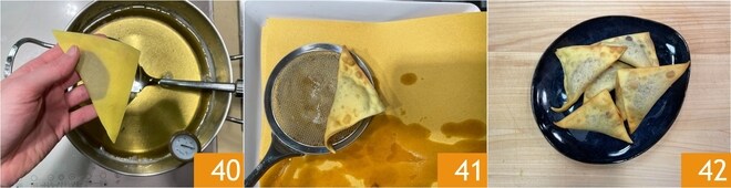 Faites frire quelques pièces à la fois en les immergeant dans l'huile chaude, préchauffée à 170° 40. Lorsqu'elles sont bien dorées, après environ deux minutes, égouttez-les sur une feuille de papier absorbant 41, afin d'enlever l'excès d'huile. Laissez tiédir et servez 42.