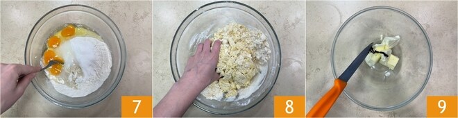 Commencez à pétrir avec une cuillère 7 puis travaillez quelques minutes à la main 8. Versez le beurre mou dans un bol, ajoutez les graines de la gousse de vanille 7 et écrasez-le avec une fourchette.