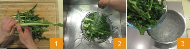Pour préparer la chicorée à la poêle, commencez par faire bouillir une casserole avec beaucoup d'eau qui vous servira à blanchir la chicorée, puis passez au nettoyage : éliminez la base du bouquet avec la partie finale des tiges et les éventuelles feuilles abîmées 1, puis rincez-la soigneusement sous l'eau courante 2. Lorsque l'eau arrive à ébullition, ajoutez la chicorée 3 et blanchissez-la pendant 5 minutes.