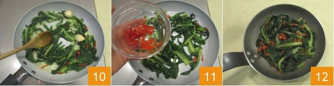 et continuez à cuire à feu doux pendant une dizaine de minutes, en remuant souvent 10. Une fois prête, éteignez le feu, retirez les gousses d'ail et ajoutez le reste du piment frais haché 11. Votre chicorée à la poêle est prête à être servie bien chaude 12 !