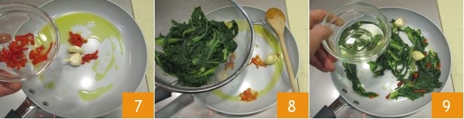 Maintenant, versez l'huile dans une poêle, ajoutez les gousses d'ail en chemise légèrement écrasées ainsi qu'une partie du piment 7 et laissez revenir à feu modéré pendant quelques minutes en remuant de temps en temps, puis ajoutez la chicorée blanchie et égouttée 8, salez et mélangez. Versez ensuite un peu d'eau de cuisson de la chicorée que vous aviez réservée 9
