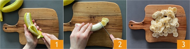Pour préparer les chips de banane, commencez par éplucher les bananes 1 et coupez-les finement 2, obtenant des tranches épaisses de maximum 3 mm 3.