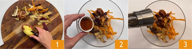 Pour préparer les chips de pelures de légumes, commencez par laver soigneusement les légumes, puis essuyez-les et épluchez-les avec un épluche-légumes 1. Séchez à nouveau bien les épluchures, transférez-les dans un bol et assaisonnez avec du paprika 2 et du poivre 3.