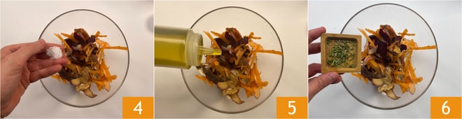 Salez 4, assaisonnez avec l'huile 5 et relevez avec du romarin 6. Mélangez très bien pour répartir les saveurs.