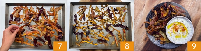 Disposez les épluchures sur une plaque 7 et faites cuire au four statique préchauffé à 200° pendant au moins 15 minutes ou jusqu'à ce qu'elles soient croustillantes 8. Les temps peuvent varier d'un four à l'autre. Sortez du four et laissez refroidir les chips de pelures de légumes avant de les servir 9.