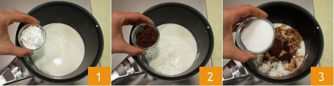 Pour réaliser le chocolat chaud au café, préparez d'abord le café : il en faudra 30 g. Puis hachez le chocolat noir et mettez-le de côté. Versez le lait dans la casserole avec la fécule de maïs 1, ajoutez également le cacao 2 et le sucre 3,