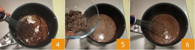 mélangez 4 et portez à ébullition à feu moyen, en remuant continuellement avec un fouet ; cela prendra environ 4-5 minutes. Une fois arrivé à ébullition, le chocolat aura épaissi, alors versez le chocolat haché 5. Continuez la cuisson juste le temps de faire fondre le chocolat, toujours en remuant 6.