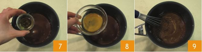 Retirez du feu et ajoutez le brandy 7 et le café 8, mélangez encore 9 et votre chocolat est prêt.