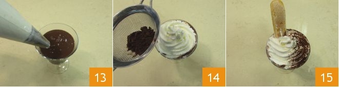 en garnissant avec une noix de crème fouettée 13 et une pincée de cacao 14. Accompagnez le chocolat chaud au café d'un biscuit à la cuillère 15 !