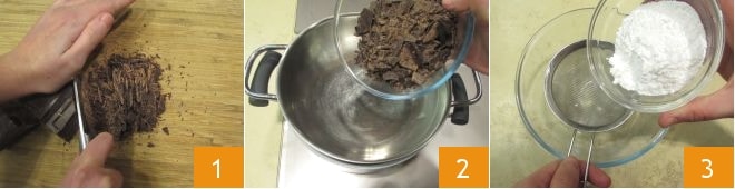 Pour préparer le chocolat chaud sur bâton, tout d'abord hachez grossièrement le chocolat noir avec un couteau 1, puis faites-le fondre au bain-marie: remplissez d'eau une casserole jusqu'à un quart, placez dessus un bol, versez à l'intérieur le chocolat haché 2 et faites cuire à feu très doux jusqu'à ce que le chocolat devienne fluide, en faisant attention à ce que l'eau dans la casserole ne touche pas le fond du bol. Pendant ce temps, dans un bol séparé, tamisez la fécule de maïs 3,