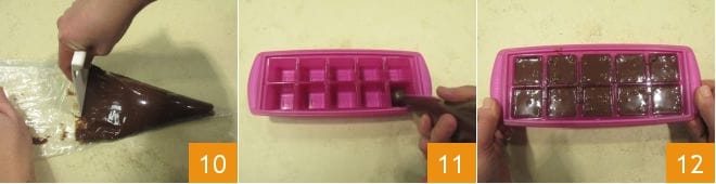 A ce stade, transférez le mélange de chocolat dans une poche à douille jetable 10, coupez la pointe et répartissez-le uniformément dans un moule à glaçons 11, puis tapez délicatement le moule sur le plan pour niveler la surface et éviter la formation de bulles d'air 12.
