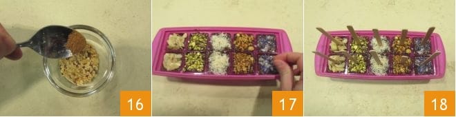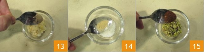Vous pouvez maintenant passer à la préparation des garnitures personnalisées en mélangeant dans différents petits bols des paires d'ingrédients : nous avons mélangé des amandes effilées et de la cardamome en poudre 13, de la noix de coco râpée et du gingembre en poudre 14, de la pistache concassée et du piment en poudre 15,
