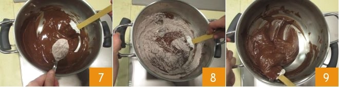 Lorsque le chocolat est fondu, ajoutez le mélange de poudres une cuillère à la fois, sans éteindre le feu 7, en mélangeant continuellement avec soin 8 jusqu'à ce que les ingrédients soient bien amalgamés 9.