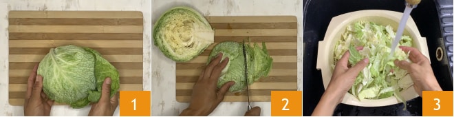 Pour réaliser le chou à la salentine, commencez par effeuiller le chou pour éliminer les feuilles extérieures les plus dures 1, divisez-le en deux et ensuite tranchez-le en fines lanières 2. Lavez-le sous l'eau courante 3 et mettez de côté.
