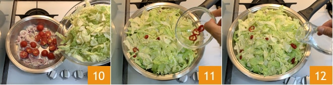 le chou égoutté 10 et le piment coupé en rondelles 11, salez et couvrez d'eau 12.