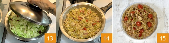 Faites cuire pendant 30 minutes avec le couvercle 13 et complétez la cuisson pendant une dizaine de minutes sans couvercle, afin de faire évaporer l'excès d'eau. Le chou à la salentine est prêt 14, servez-le bien chaud à table 15.