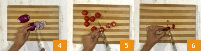 Épluchez l'oignon et émincez-le 4. Lavez les tomates cerises et coupez-les en deux 5. Coupez également un piment frais en rondelles 6.