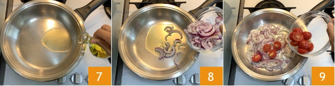 Chauffez dans une poêle 5 cuillères à soupe d'huile d'olive extra vierge 7, ajoutez l'oignon 8, laissez-le fondre à feu vif pendant deux minutes. Ajoutez les tomates cerises coupées en deux 9