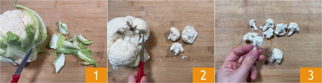 Pour préparer le chou-fleur poêlé, commencez par le nettoyer : retirez les feuilles extérieures 1, puis, à l'aide d'un petit couteau, coupez la base des bouquets 2 et séparez les plus petits morceaux avec les mains 3.