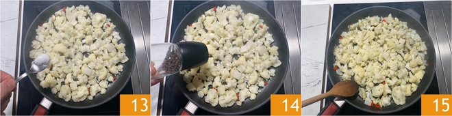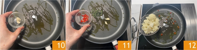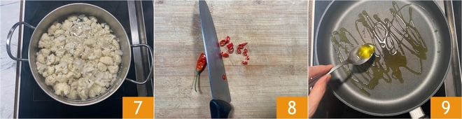 Faites revenir avec les gousses d'ail épluchées 10 et le piment coupé 11. Une fois cuit, égouttez le chou-fleur à l'aide d'une écumoire et transférez-le dans la poêle avec un peu de son eau de cuisson 12.
