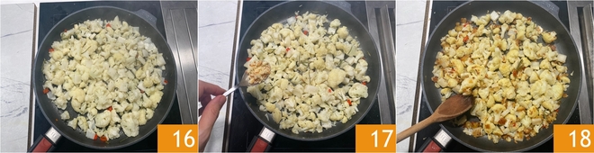 Faites cuire 5 minutes à feu moyen-vif 16. Au bout de ce temps, ajoutez la chapelure rustique 17 et mélangez le tout 18 ; si nécessaire, mouillez avec un peu d'eau.