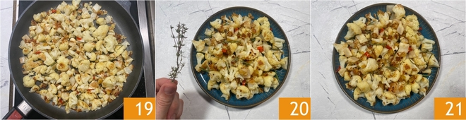 Poursuivez la cuisson encore 5 minutes toujours à feu moyen-vif 19. Lorsque les bouquets seront bien dorés, parfumez avec du thym frais 20. Votre chou-fleur poêlé est prêt à être servi 21 !