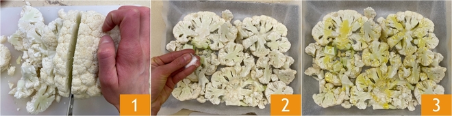 Pour préparer le chou-fleur gratiné aux épices, commencez par nettoyer le chou-fleur : éliminez la base et les feuilles les plus externes, puis coupez-le en tranches épaisses, en vous aidant d'un couteau bien aiguisé et en essayant de les garder aussi intactes que possible 1. Disposez au fur et à mesure les tranches et les parties les plus petites sur une plaque recouverte de papier sulfurisé, puis assaisonnez-les avec une pincée de sel répartie uniformément 2. Ajoutez un filet d'huile d'olive extra vierge, en veillant à bien arroser toute la surface du chou-fleur 3, puis enfournez dans un four statique préchauffé à 200 °C et laissez cuire environ 10 minutes, juste le temps de le rendre légèrement tendre.