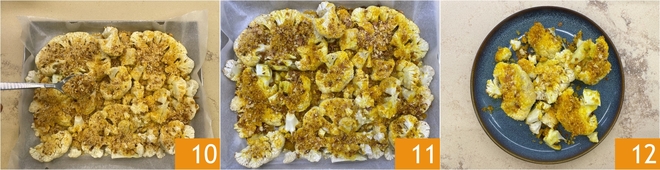 Retirez le chou-fleur du four et répartissez généreusement et uniformément la panure sur toutes les tranches, en vous aidant d'une cuillère et en veillant à l'adhérer bien à la surface 10. Remettez ensuite la plaque au four à la même température et poursuivez la cuisson encore 8-10 minutes, jusqu'à ce que le chou-fleur soit tendre à l'intérieur et que la surface soit bien dorée et croustillante 11. Une fois prêt, sortez le chou-fleur gratiné aux épices du four et servez-le chaud 12!