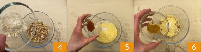 Entre-temps, préparez la panure : versez dans un bol la chapelure avec le Parmesan Reggiano râpé 4, puis ajoutez la farine de maïs et une pincée de sel. Ajoutez les épices, en commençant par le paprika, à la fois doux et piquant 5, et en continuant avec le curry 6.